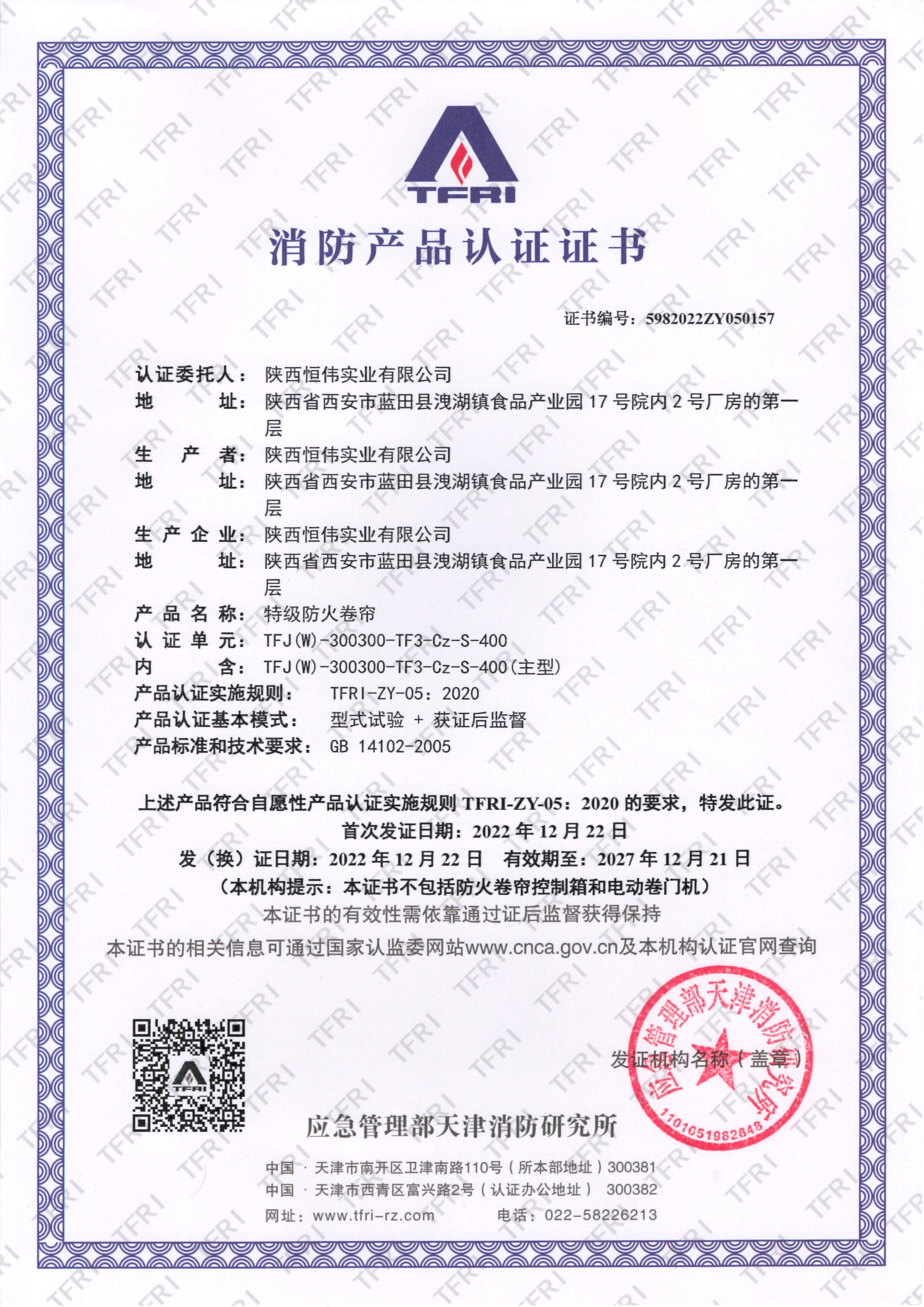 陕西恒伟实业有限公司生产钢质防火门,钢质防火卷帘门,无机布防火卷帘门,挡烟垂壁等产品。可广泛应用于现代化高层建筑、工业建筑、厂房、宾馆等。![]()